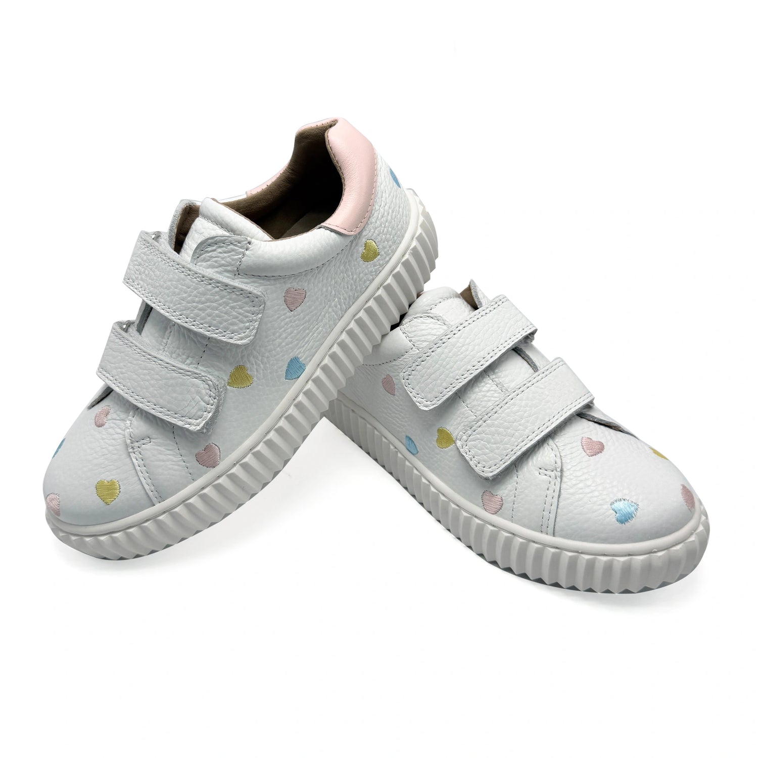 These playful Porte sneakers are crafted from white cow leather and feature a convenient double hook-and-loop (Velcro) strap closure. The design is accented with a pink heel counter and colorful embroidered hearts on the side. Set on a chunky white platform sole, this model runs true to size.
